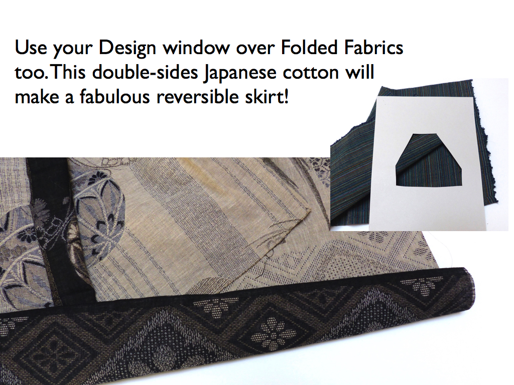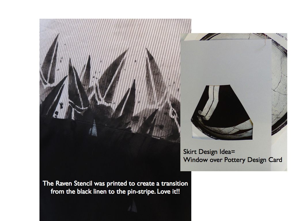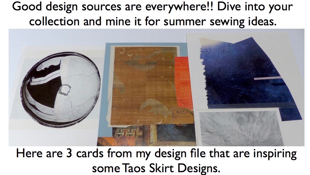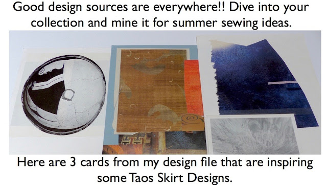 2. Design Windows: Using a sheet of cardstock, cut out and use a silhouette of the Taos Skirt (or any pattern) as a window over a collection of images or fabrics to generate new design ideas. See the design cards above used in the designs in the following photos. Any pattern piece (or garment silhouette) can be cut as a window and will give an unexpected view every time...welcome to magic!