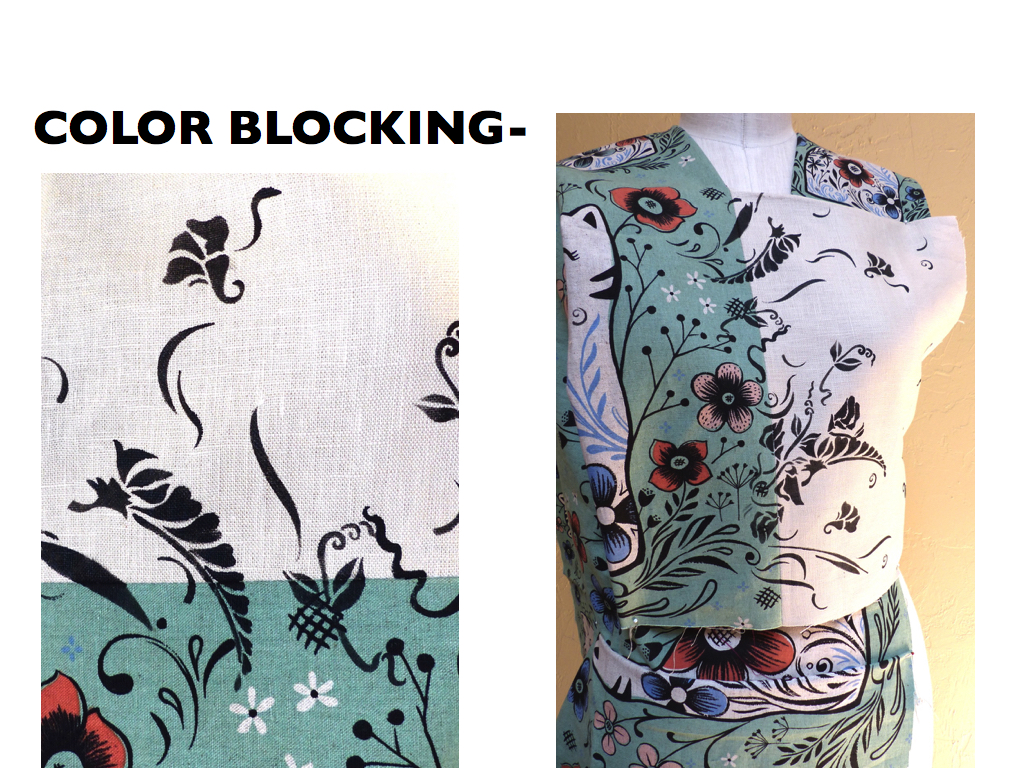 Color Blocking is perfect for exploring combinations of favorite prints and solids. Consider working with on a dressform....it brings your combination into focus as a garment right away.