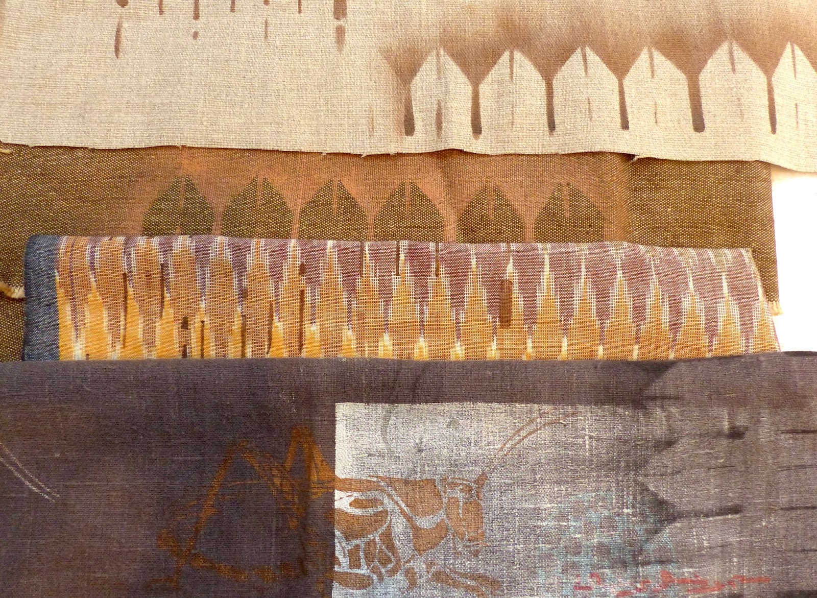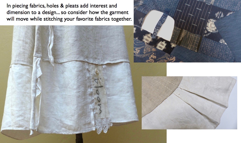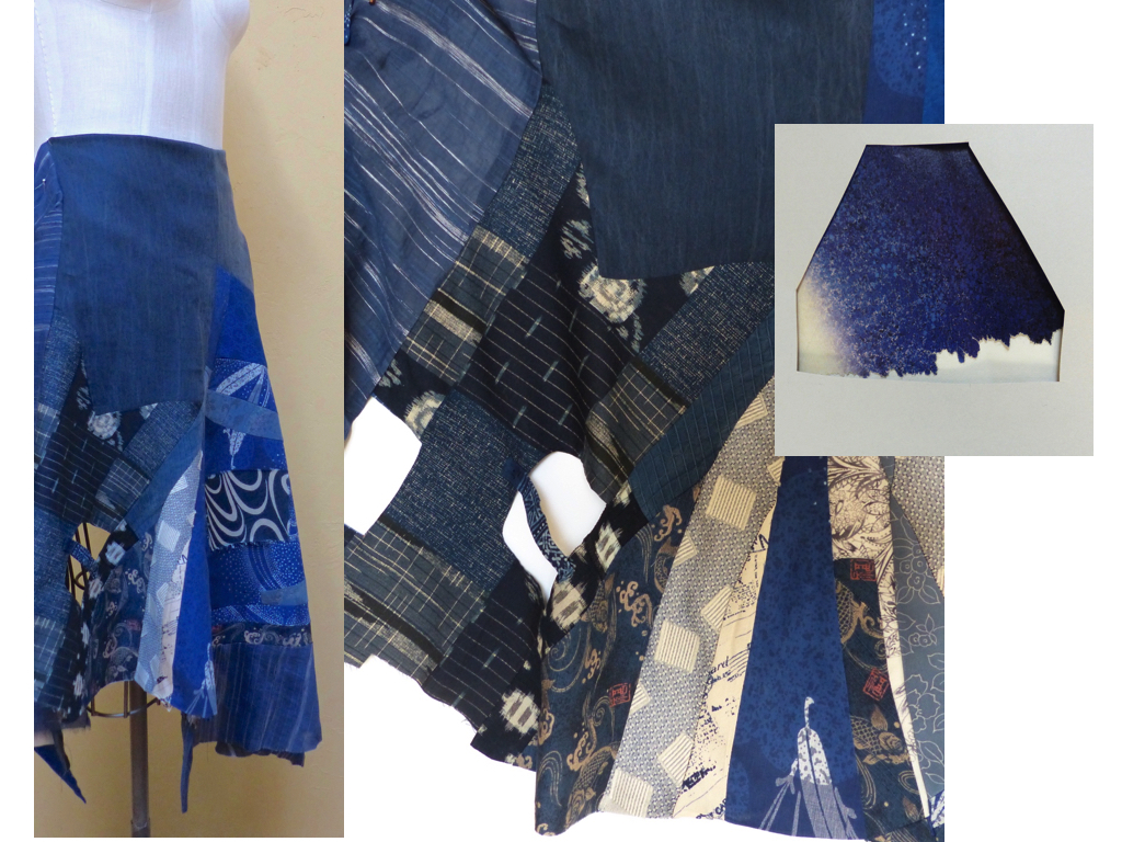 Fabrics can be high contrast (which exaggerates seamlines) or variations in one color with textures, prints, lights and darks as in this blue panel on the way to becoming a skirt.