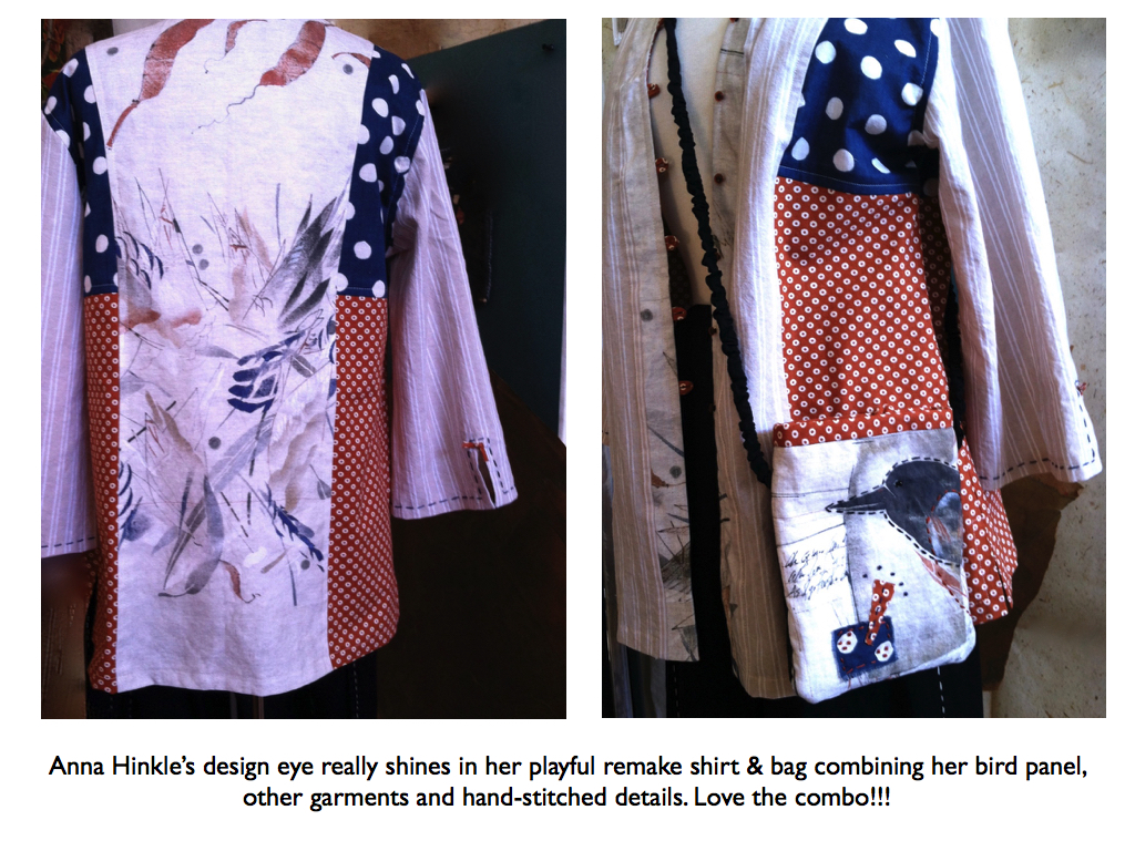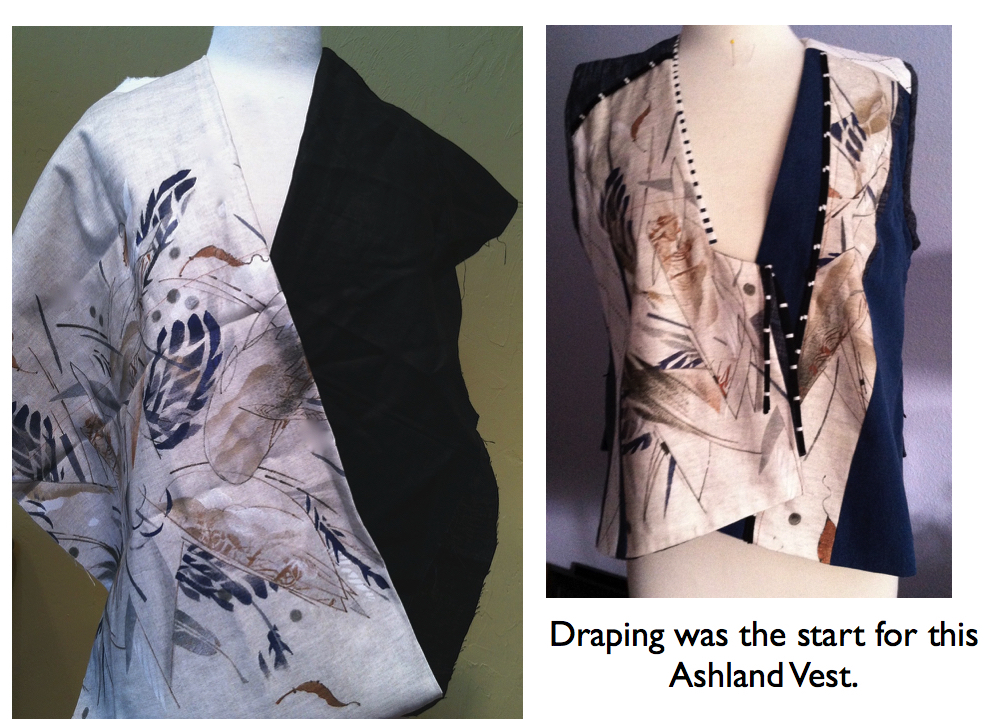 The Ashland Vest Pattern was used for this vest piece. I combined a Blue bird panel with indigo linen and a rolled stripe knit as 'piping' for accent in the seams. Combining printed images with solids into successful garments is a good workout and will continue to build your design eye. Look for unusual things to bring into your sewing...a small embroidered piece, maybe a bold hand painted. The focal piece can inspire the fabric combo too. Part of my design criteria is to build garments that can be worn casually, with jeans, or dressed up for a trip to the theater. These garments and starts have that feel.