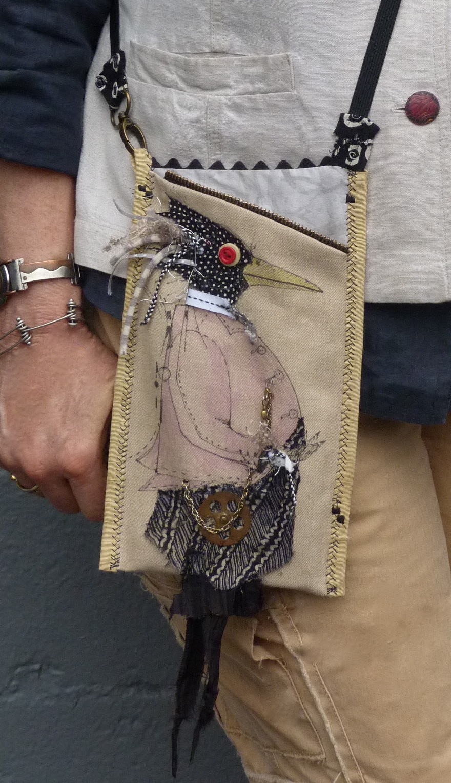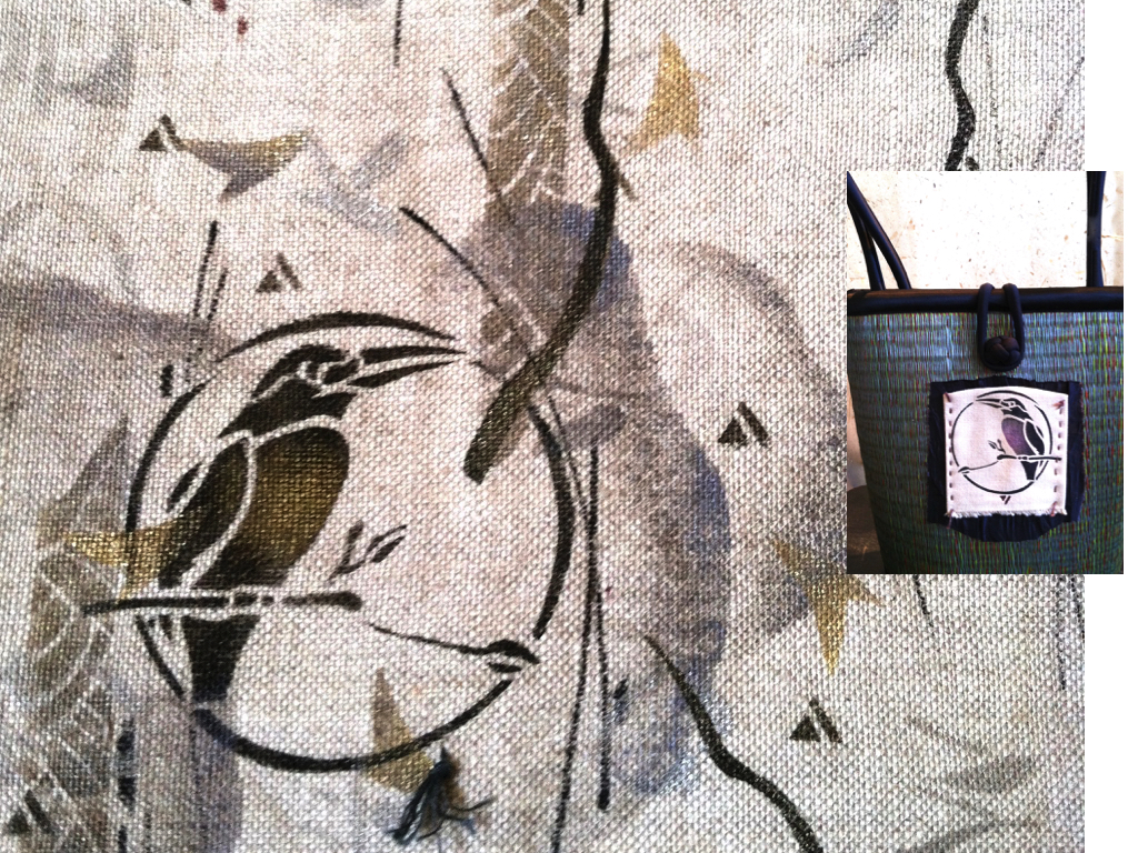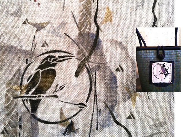 The Deco Bird Stencil was used to print a summer, linen piece and a medallion stitched onto a green straw bag. |